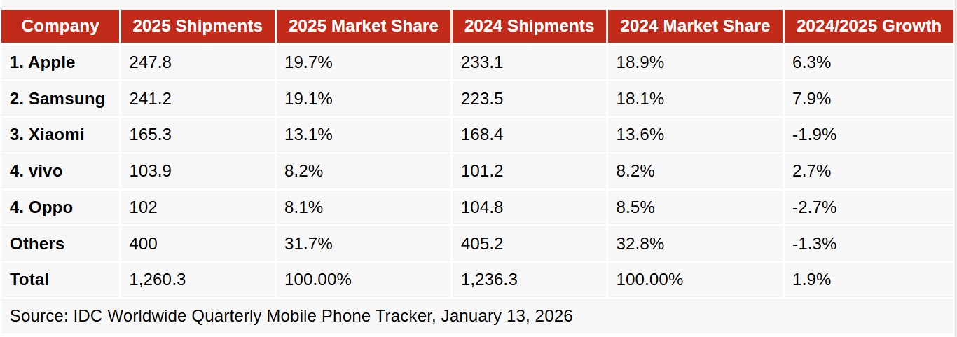 Žvelgiant į metines statistikos duomenis, 2025 m. buvo parduota iš viso 1,26 mlrd. išmaniųjų telefonų, o „Apple“ vėl buvo aiškus nugalėtojas. „Apple“ pasiekė rekordinius 247,8 mln. pardavimus per šį laikotarpį ir užėmė 19,7 % pasaulinės rinkos. Kitaip tariant, 1 iš 5 telefonų, parduotų 2025 m., buvo „iPhone“.