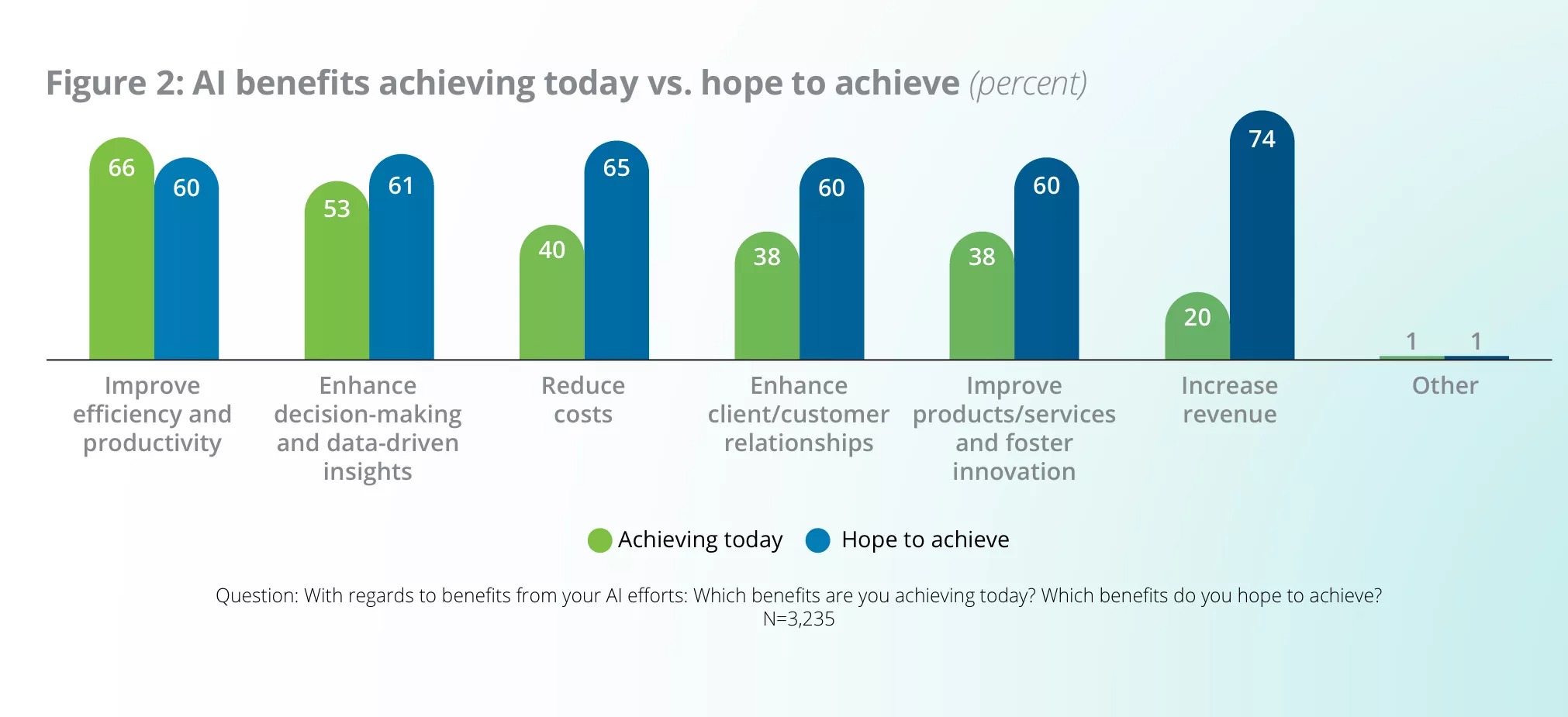 Išskaidžius privalumų skaičius, tik 20 % organizacijų teigia, kad AI šiandien didina pajamas, o 40 % teigia, kad AI mažina išlaidas. Tai panašu į PwC ataskaitą, kurioje tik 26 % generalinių direktorių teigė, kad AI mažina išlaidas, o tik trečdalis teigė, kad pajamos padidėjo. „Deloitte“ pažymi, kad didelė dalis organizacijų tikisi padidinti pajamas ir sumažinti išlaidas naudojant AI, tačiau norai mažai ką reiškia.
