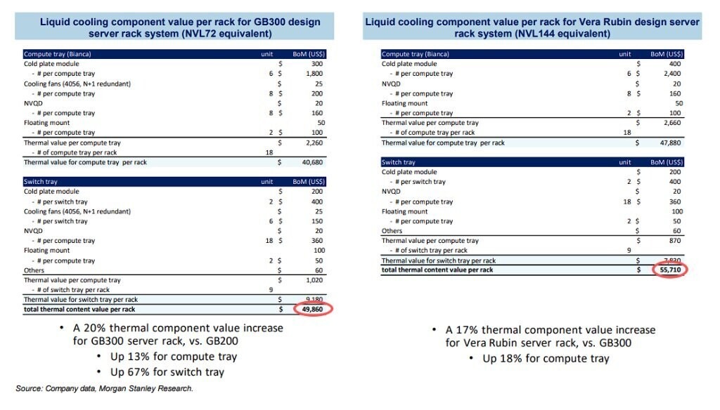 Įdomu tai, kad ataskaitoje taip pat prognozuojama, kad būsima „Vera Rubin“ NVL144 konfigūracija pareikalaus dar daugiau aušinimo komponentų, nes GPU ir jungtys didina energijos suvartojimą. „Morgan Stanley“ skaičiuoja, kad aušinimo išlaidos gali padidėti maždaug 17 % iki apie 55 710 JAV dolerių.