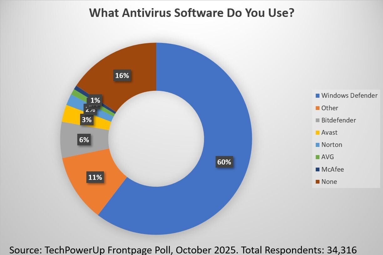 Beveik niekas nesidomi trečiųjų šalių antivirusinėmis programomis, tuo labiau nemoka už jas, rodo „TechPowerUp“ apklausos rezultatai, kurioje iš viso pateikta 34 316 atsakymų. Buvo laikas, kai be patikimos trečiųjų šalių antivirusinės programinės įrangos, už kurią kasmet reikėdavo mokėti apsaugos mokestį už atnaujinimus, nebuvo galima patikimai naudotis kompiuteriu. Tada „Microsoft“ nusprendė žymiai pagerinti „Windows Defender“.