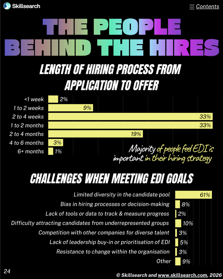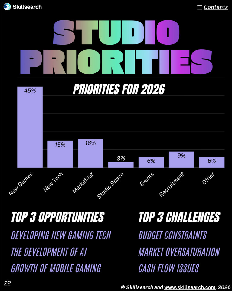 Tyrime taip pat nurodoma, kad 45 % žaidimų studijų naujus žaidimus įvardijo kaip savo pagrindinius prioritetus 2026 m., o studijų patalpos, renginiai ir darbuotojų įdarbinimas buvo mažiausiai paplitę prioritetai šiais metais. Iš respondentų, kurie nurodė dalyvavę įdarbinimo procese, 33 % teigė, kad įdarbinimo procesas truko nuo dviejų iki keturių savaičių, o dar 33 % nurodė, kad įdarbinimo procesas truko nuo vieno iki dviejų mėnesių. Didžiausi įdarbinimo iššūkiai buvo įgūdžiai ir patirtis, biudžetą viršijančios atlyginimo lūkesčiai bei užtikrinimas, kad kandidatai atitiktų įmonės kultūrą ir vertybes.