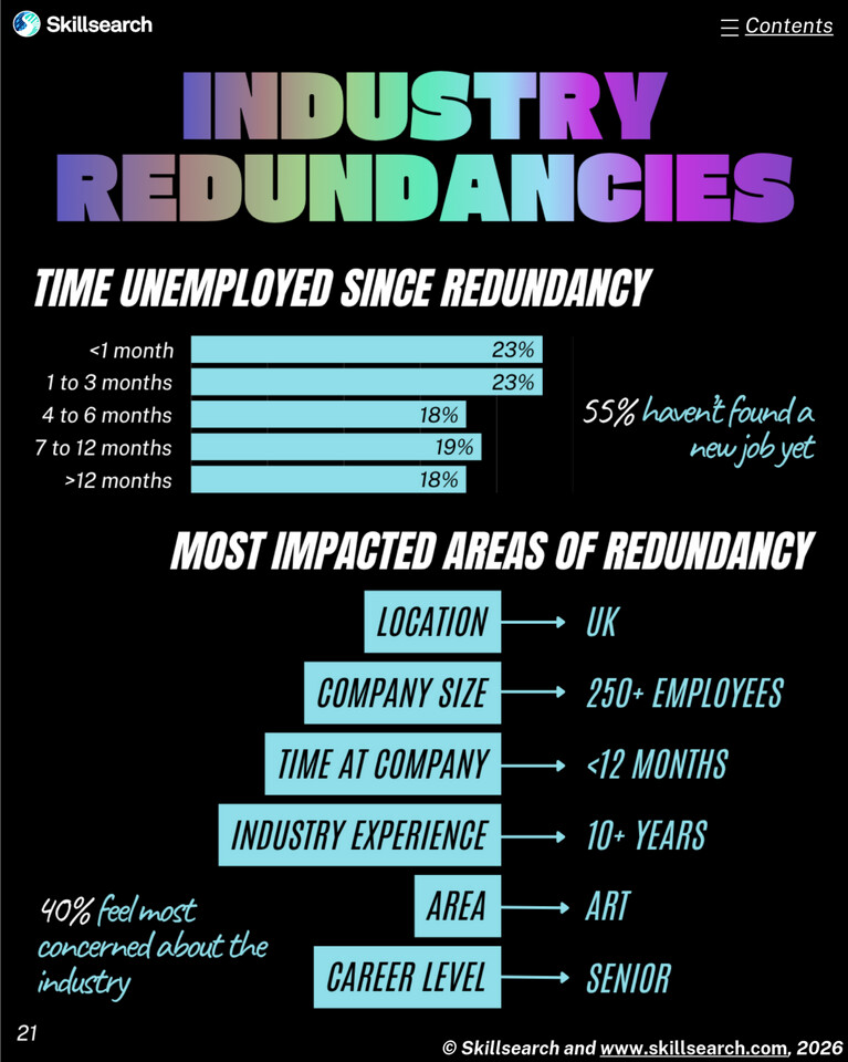 Paklausti apie žaidimų pramonės darbo rinką, atsakymai labai skyrėsi, greičiausiai iš dalies dėl to, kad tyrimas buvo skirtas daugeliui skirtingų šalių. Kalbant apie darbo paiešką, 56 % absolventų, neturinčių su žaidimais susijusio išsilavinimo, darbo paieška šioje pramonėje užtruko ilgiau nei metus, o net 25 % respondentų, turinčių žaidimų srities išsilavinimą, teigė, kad tai užtruko ilgiau nei metus. Tuo tarpu 27 % absolventų, turinčių žaidimų kūrimo laipsnį, pavyko susirasti darbą šioje pramonėje dar prieš baigdami studijas. Tuo tarpu 65 % respondentų nurodė, kad juos tiesiogiai paveikė atleidimai arba atleidimai įvyko studijoje, kurioje jie dirba, o 22 % darbuotojų teigė, kad buvo atleisti per pastaruosius 12 mėnesių. Iš tų, kurie buvo atleisti, 52 % buvo „nepatenkinti savo išeitinėmis išmokomis“. Tik 45 % atleistųjų nuo to laiko susirado naują darbą, o tik 27 % tų darbuotojų jaučiasi saugūs savo naujose pareigose. Net 37 % atleistųjų yra bedarbiai ilgiau nei septynis mėnesius.