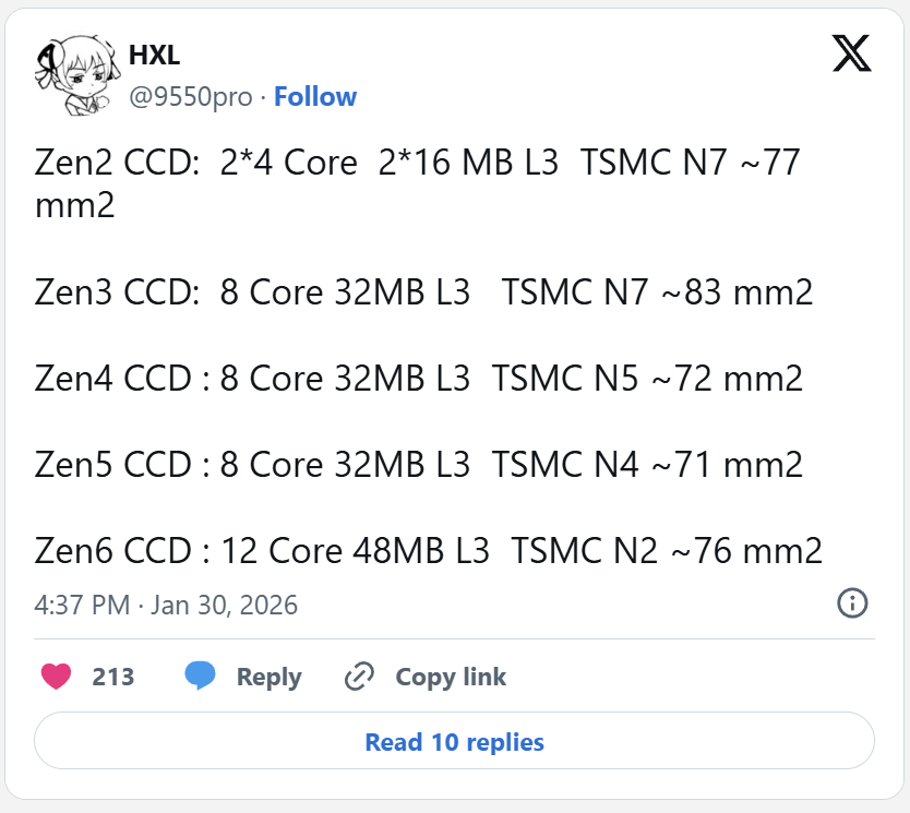 Sklando nauji teiginiai apie „Zen 6“ CCD dydį ir savo skaičius paskelbė HXL. Jei skaičiai pasitvirtins, „Zen 6“ pereitų nuo 8 iki 12 branduolių viename CCD ir nuo 32 MB iki 48 MB bendros L3 atminties. Tai yra 50 % šuolis tiek branduolių skaičiaus, tiek L3 talpos atžvilgiu. Pranešamas lusto ploto pokytis yra apie 5 mm², arba maždaug 7 % palyginti su „Zen 5“.
