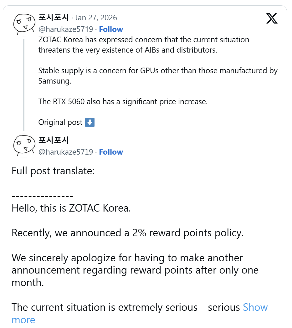 Neseniai paskelbtame „Zotac“ Pietų Korėjos padalinio pranešime, išverstame žinomo informacijos nutekintojo @harukaze5719, teigiama, kad 2026 m. ir galbūt vėliau GPU taps brangesni ir sunkiau įsigyjami. ASUS ir kiti gamintojai pradeda kelti kainas, o „Zotac“ šiuo metu nemato šviesos tunelio gale.