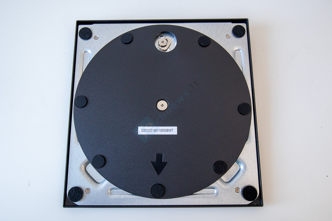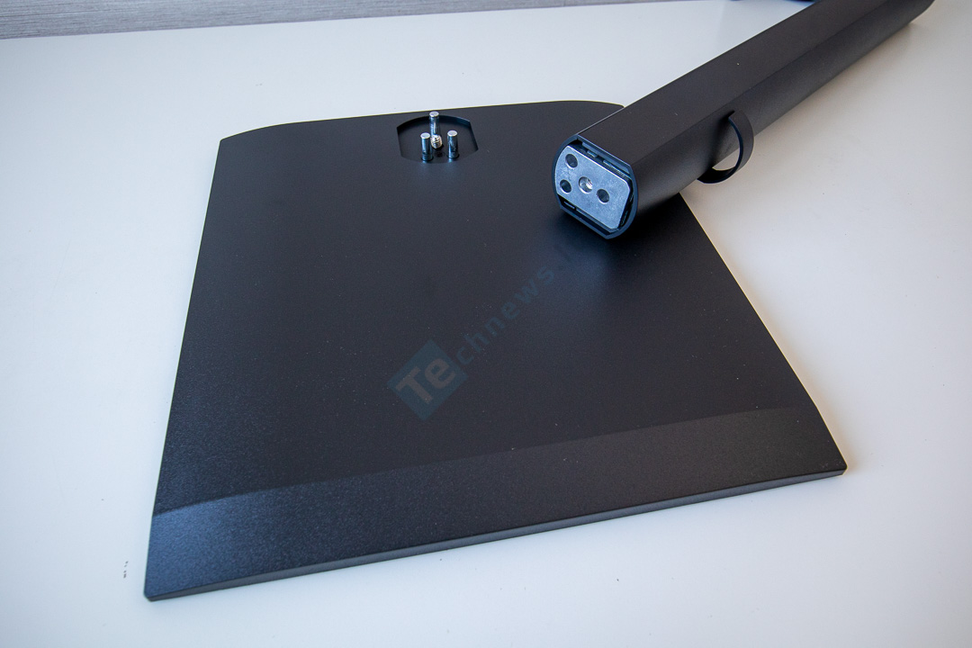 Kaip įprasta, norint surinkti monitorių nereikia jokių įrankių. Stovo padas prie stovo kojos tiesiog prisisuka varžtu su rankenėle. Šis stovas yra tikrai sunkus ir tvirtas. Didesnis nei įprastas svoris ypač jaučiasi kilnojant padą, tad gerą stabilumą tikrai turėsime. Stovo konstrukcija yra metalinė, bet iš išorės plastmasė, kuri atrodo geros kokybės. Stovo padas turi nemažai padukų ir ant stalo stovi labai tvirtai.