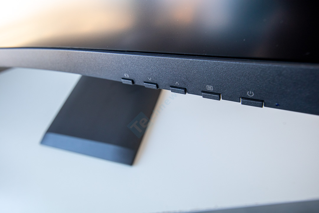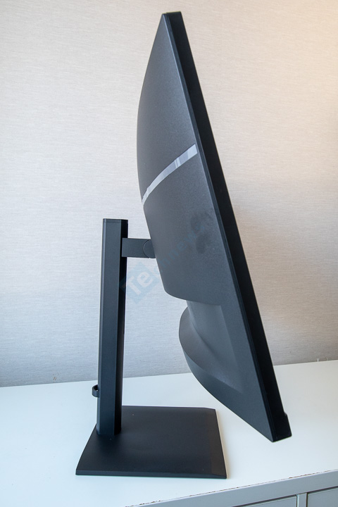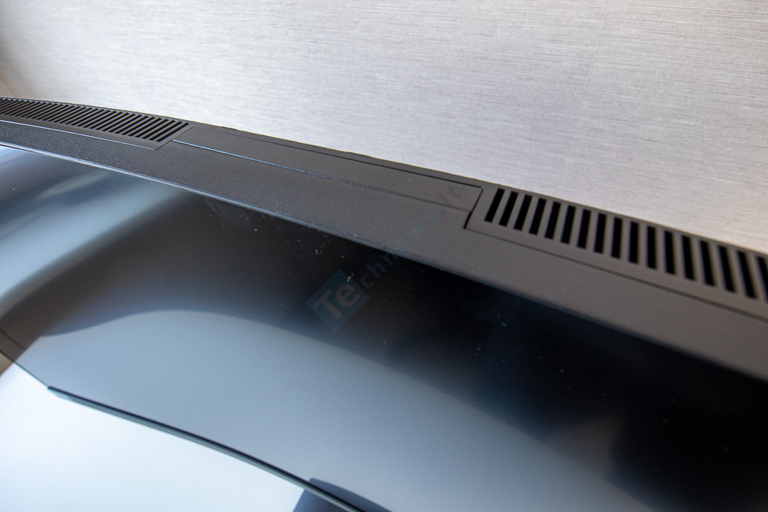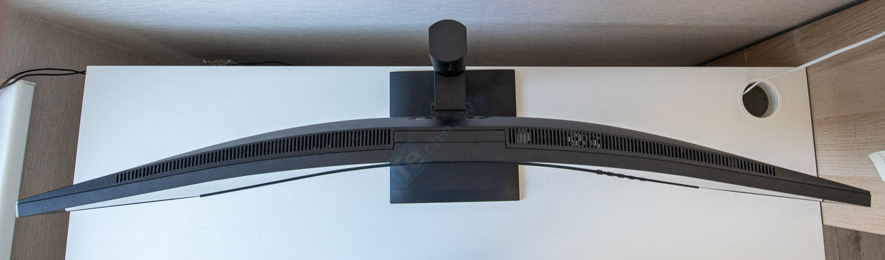 Iš viršaus matosi, kad į gylį monitoriaus sąranka yra pakankamai kompaktiška. Tai dėl to, kad stovo padas per daug neišsikiša į priekį, tokią problemą turi V formos didesnių monitorių padai.