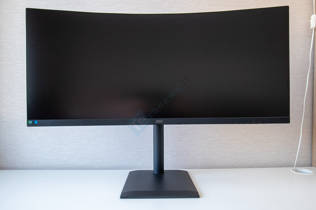 „AOC CU34E4CW“ yra švaraus dizaino, nieko kito ir nesitikėčiau iš monitoriaus skirto darbui. Spalvinė gama irgi nestebins, juodas plastikas visur. Ekrano šoniniai ir viršutinis rėmelis yra paslėpti, tai irgi įprastas dizaino akcentas. Apatinis rėmelis, tradiciškai yra platesnis, jo viduryje AOC užrašas. Kas krenta į akis surenkant monitorių tai jo svoris. Ekranas su stovu sveria 10 kg, o tai tikrai jaučiasi, palyginus su žaidimų monitoriais, kurie yra lengvesni. Pats ekranas sveria net 7,33, matyt dėl įvairios įmontuotos papildomos įrangos.