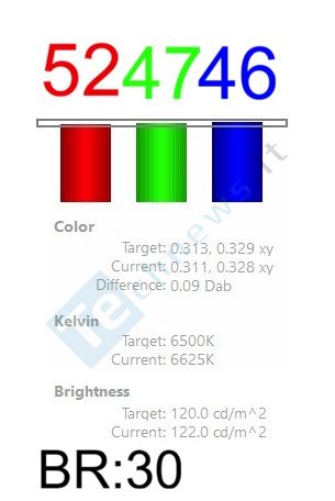 Kalibruojant buvo naudojamas User spalvų profilis, kuriame galime reguliuoti spalvų kanalų intensyvumą. Kaip visada, ryškumą taikėme į 120 cd/m2, balto taško temperatūrą į 6500K ir į kuo tolygesnio intensyvumo spalvas. Kalibruoti sekėsi sunkiai, dėl ko galiausiai palikau 6600K baltą tašką. o tam raudoną spalvą pakėliau iki 52, žalią pamažinau iki 47, o mėlyną nustačiau į 46. Norint 120 cd/m2 reikėjo 30 proc. ryškumo nustatymo. Dar reikėjo pakeisti ir Gamma, vietoj 2.2 parinkau 2.4, kas suteikė realią 2.1 Gamma.