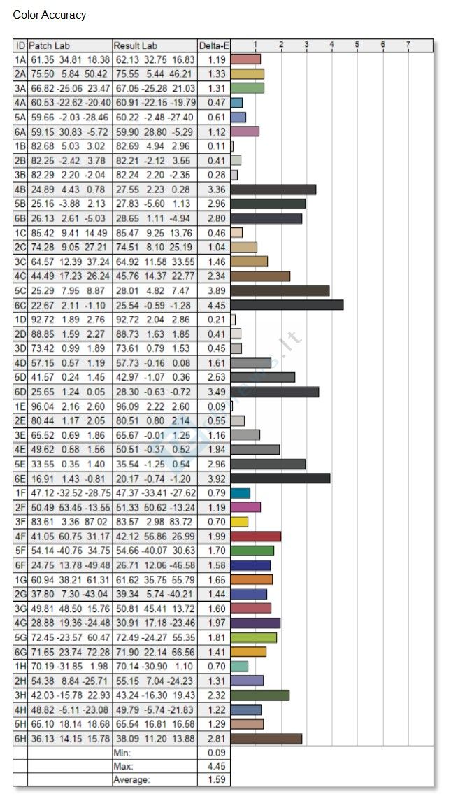 Padarius šiuos pakeitimus, bendras spalvų tikslumas pagerėjo iki Delta E 1,59, tai yra 0,22 pagerėjimas. Vis šis tas, bet maksimalūs juodų spalvų netikslumai nepasitaisė, tiesiog spalvos pagerėjo bendrai. Tad vis dar yra nemažai spalvų kurios viršija ne tik Delta-E 2 reikšmę, bet ir Delta-E 3 ar net Delta-E 4.