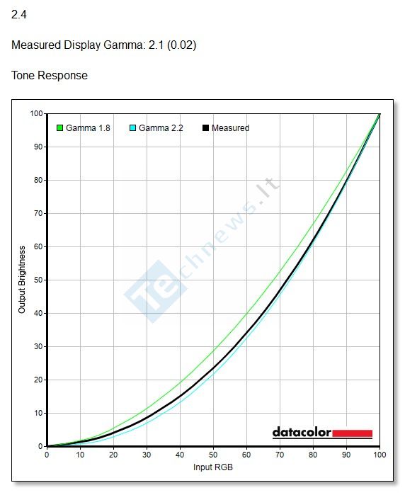 Matuoklis rodo, kad po kalibravimo P3 spektro aprėptis pablogėjo 1 %, o sRGB ir AdobeRGB aprėptis liko nepakitusi, atitinkamai 99 % ir 86 %. Sukalibravus monitorių, kaip visada, šiek tiek nukrito kontrastas, dabar jis sukosi ties 1500:1 zona, kas vis tiek yra labai gerai. Gama pakeitus į 2.4 jau gauname 2.1 reikšmę, tai yra daug arčiau norimos 2.2 reikšmės.