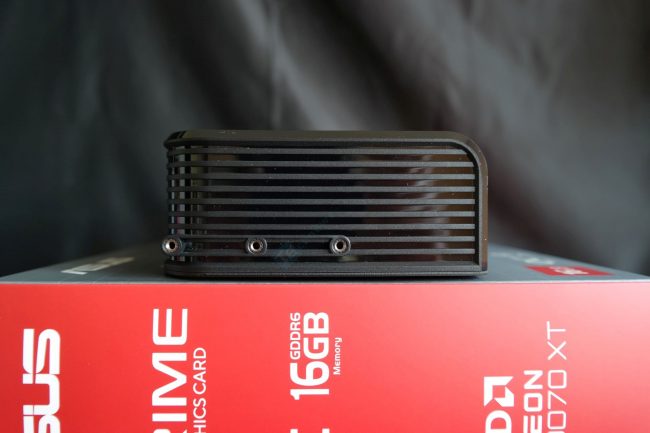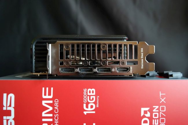 Kaip ir etaloninis 9070 XT modelis, ASUS vaizdo plokštė turi 3x DisplayPort 2.1a ir 1x HDMI 2.1b išvestis. DisplayPort jungtys yra suderinamos su UHBR13.5 sertifikatu. Gale – trys taškai plokštei paremti ant laikiklio.
