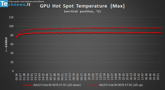 Pastačius „Jonsbo Z20“ korpusą ir jame esančią „Prime OC“ į vertikalią poziciją gauname labai įdomius rezultatus. Jeigu vaizdo plokštės I/O nukreiptas žemyn hot spot temperatūra išlieka identiška tai, kurią fiksavome naudojant vaizdo plokštę horizontalioje padėtyje. Štai jeigu I/O nukreiptas žemyn, „Prime OC“ temperatūra pastebimai didėja ir beveik pasiekia 100 °C. Iki 3500 RPM (Performance BIOS) įsisukę ventiliatoriai padaro vaizdo plokštę kurtinančiai garsia.