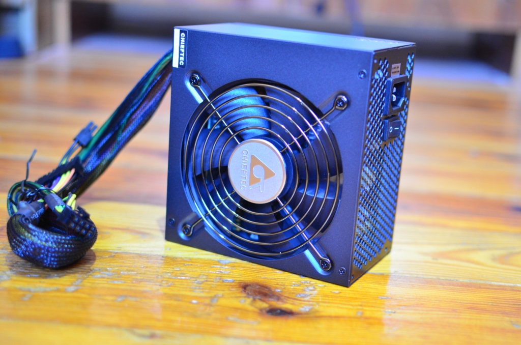 Lipdukai su elektrinėmis specifikacijomis užklijuoti tiek ant vieno iš PSU šonų, tiek ant viršaus. Ventiliatoriaus pozicija nėra visiškai centre ir yra pastumta kiek į šoną. Ventiliatorius apsaugotas metalinėmis grotelėmis, kurių centre firminis “Chieftec” logo. Viename gale – įprastos korio formos grotelės, 90o kampu pasuktas AC lizdas ir įjungimo/išjungimo mygtukas. Kitame – pora neatjungiamų laidų ir vietos skirtos atjungiamiems laidams. PCI-E laidai kišami į raudonos spalvos lizdus, SATA ir molex – į juodos. Sumaišyti laidus vietomis praktiškai neįmanoma, nes skiriasi ne tik spalva, užrašai, bet ir PCI-E skirtos vietos turi dviem kontaktais daugiau.