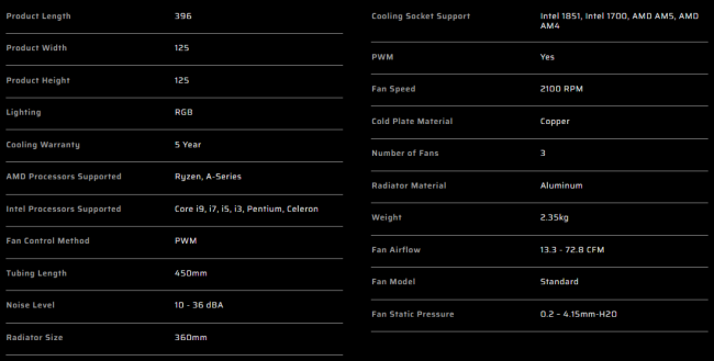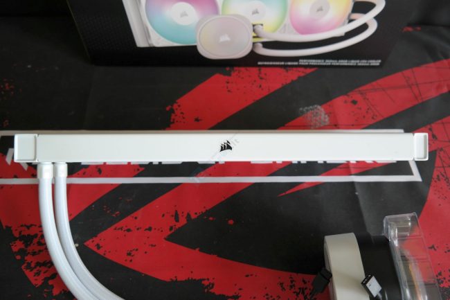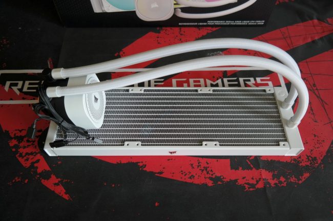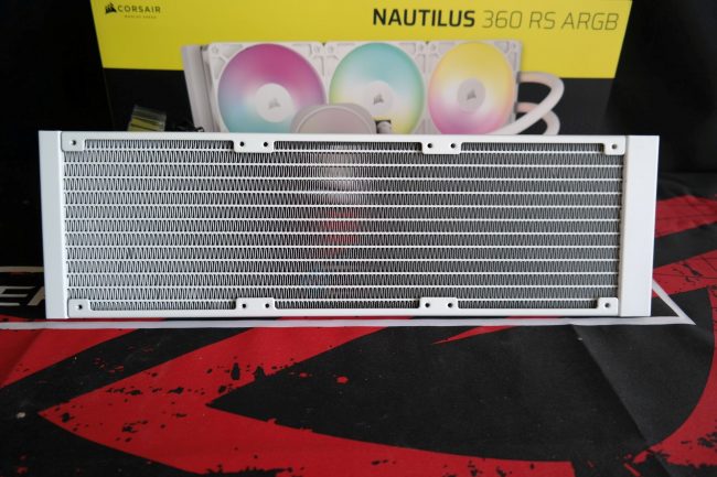Iš aliuminio pagamintas radiatorius yra standartinio 27 mm storio ir abipus šonų turi blizgius „Corsair“ logotipus. Tikslūs radiatoriaus išmatavimai: 396 x 125 x 27 mm. Radiatoriuje yra 12-a šilumos vamzdelių. Apvijų išdėstymo tankis standartinis daugeliui AIO sistemų. Dažymo kokybė atitinkanti standartus.