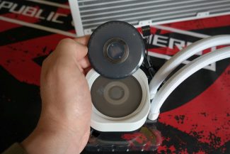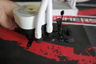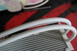 Tiek inlet, tiek outlet portai su radiatoriumi susieti neatjungiamomis jungtimis. Nailonines rankoves turinčių žarnelių, kurioms „Corsair“ neparūpino jokio surišėjo, ilgis 450 mm. Išorinis/vidinis diametrai nėra žinomi, tačiau vizualiai žarnelės įprasto storio ir lankstesnės už „Liquid Freezer III“ žarneles. Šone guminiu spaustuku paslėpta užpildymo anga, tačiau gamintojas nenurodo, ar vartotojas gali prie jos „kišti nagus“.