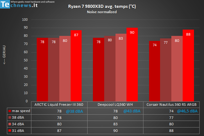 „Nautilus 360 RS ARGB“ po 20 min trukmės „Cinebench r23“ kilpos su 74 °C vidutine „Ryzen 7 9800X3D“ temperatūra užima lyderiaujančios sistemos poziciją, bet šis AIO pirmauja ir pagal triukšmą. Fiksuojame net 46,5 dBA (2100 RPM), kai „Liquid Freezer III“ triukšmas siekia ~38 dBA (1900 RPM), „Deepcool LQ360 WH“ – 43 dBA (2150 RPM). Sumažinus „Nautilus RS“ triukšmą iki 38 dBA (sūkius reikia sumazinti iki 1550 RPM) paaiškėja, kad niekuo nenusileidžiama ARCTIC sistemai – paklaidos lygio 1 °C skirtumas. Įtempta kova vyksta ir prie mažesnių triukšmo verčių: arba lygybė, arba to paties 1 °C skirtumas. Tik „Deepcool“ sistemai nė vienu atveju nepavyksta rimčiau įsitraukti į kovą. Testavimas buvo atliktas sistemoms esant sumontuotoms „Phanteks Enthoo Prime“ (ventiliatoriai 50 %) korpuso viršuje, aplinkos temperatūrą palaikant tarp 20-21 °C.