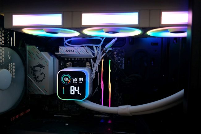 Apie LQ360WH turimą ekranėlį. Jis neveiks be įrašyto ir paleisto „Deepcool“ programinio įrankio. Pagal užimamą svorį (beveik 1,5 GB) įrankis nesiūlo daug: tik pagrindinę informaciją apie sisteminius komponentus ir patį AIO, be papildomų valdymo/konfigūravimo funkcijų. Ekranėlyje pateikiamos informacijos suskirstymas segmentais ir pats grafinis apipavidalinimas mums patinka. Apkrova ir temperatūra atvaizduojama ne vien skaičiais, bet ir grafiškai. Monitoring’o pokyčiai vyksta akimirksiu, informacija teisinga, t.y. rodmenys pateikiami iš Tdie ir Package Power daviklių. Aštrumas geras. Pridedame ARGB Halo apšvietimą, baltą spalvą, patogią ventiliatorių sujungimo metodą ir iš estetinės pusės priekaištų kiek daugiau nei 100 eurų kainuojančiai 360 mm sistemai nėra.