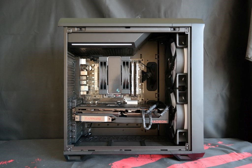 Kadangi „RMx Shift“ „Torrent Compact“ korpuse naudoti neįmanoma, turėjome rinktis kitą maitinimo šaltinį, „Corsair AX860i“. 160 mm ilgio maitinimo šaltinis leido turėti pakankamai vietos už jo, kur galėjome laikyti kabelių perteklių. HDD narvo buvo atsisakyta, tačiau realu, jog jis būtų tilpęs. Aiškus prioritetas šiame korpuse nenaudoti ilgo maitinimo šaltinio. Sumontavus 313 mm ilgio „Sapphire RX 7900 XTX Pulse“ iki priekinių ventiliatorių liko ~2 cm.
