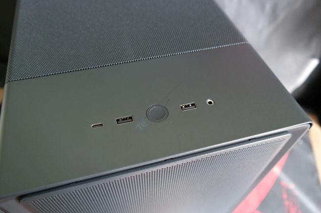 Korpuso viršuje randame dvi USB-A 3.0 (5 gbps) ir 20 gbps spartos USB-C jungtis. Apvalios formos įjungimo mygtukas pagamintas ne iš kieto, o minkšto plastiko bei turi mažą power LED’ą.