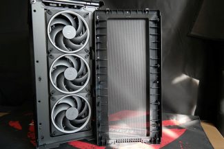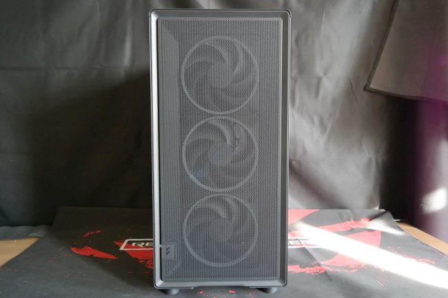 Už metalinį tinklelį (atskiro dulkių filtro nėra) turinčio priekinio gaubto išrikiuoti trys „Momentum 14 RGB“ ventiliatoriai, kurie orą paima vien tik pro korpuso priekį – šonai yra uždari. Tai FDB guolius naudojantys įrenginiai, išvystantys iki 1800 RPM. Kadangi atskiro RGB valdiklio „Epoch XL“ neturi, apšvietimas valdomas motininės plokštės programinės įrangos prijungus ventiliatorius prie 3-pin ARGB lizdo. Priekinė panelė nuimama lengvai, tereikia patraukti už apačios.