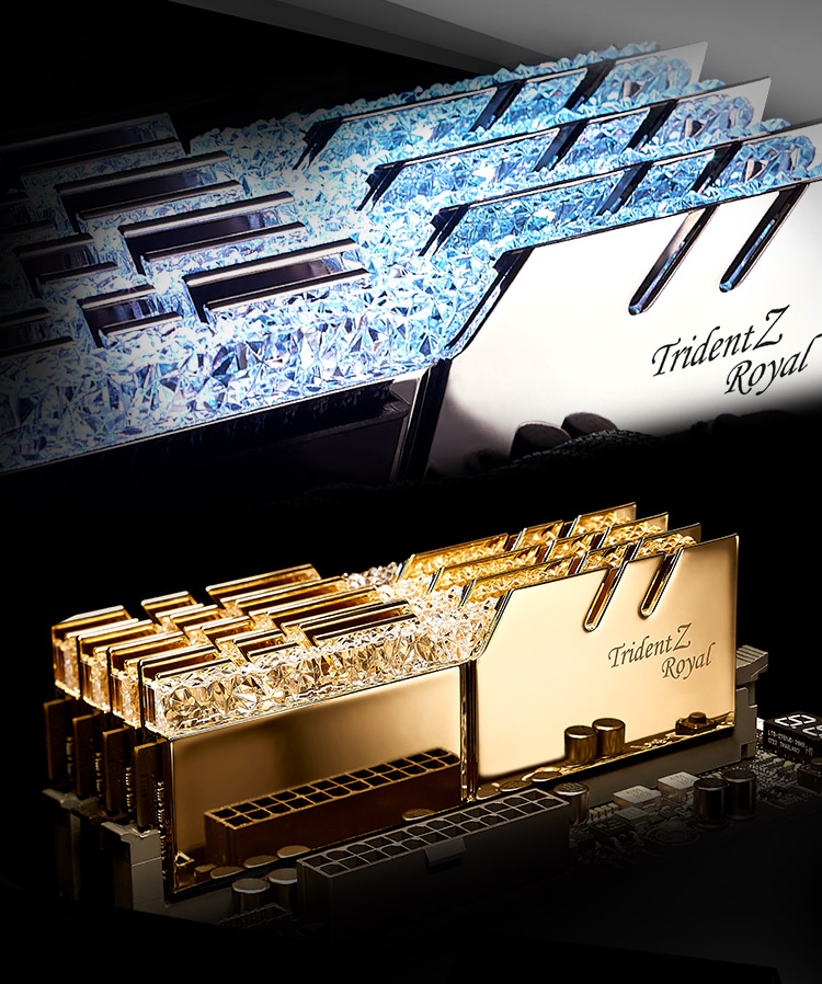 Didžiausias G.SKILL portfelis, žinoma, yra DDR4 operatyvios atminties portfelis, kuriame yra bemaž pusė tuzino skirtingų serijų, tokių kaip: „Ripjaws“, „Flare X“, „Sniper X“, FORTIS… Visgi pati gausiausia serija yra „TridentZ“. Pirmiausiai su DDR4 standartu pasirodė originali „TridentZ“ atmintis, vėliau, populiarėjant RGB pašvietimui, kompanija išleido „TridentZ RGB“ ir jeigu neskaičiuosime „Computex 2019“ parodoje pademonstruotų „TridentZ Neo“ modulių, paskutinis papildymas yra „TridentZ Royal“. Pavadinime nėra raidžių junginio RGB, tačiau tai nereiškia, kad čia neturėsime RGB pašvietimo. Netrukus pamatysime, kad pavadinimas yra gana apgaulingas ir su „Royal“ kaip tik koncentruotasi į RGB fanatikus, kurių „TridentZ RGB“ išvaizda netenkina. Kol kas asmeninėje sąrašo viršūnėje yra atsidūrę „Corsair Dominator Platinum RGB“ moduliai, kurie, darant prielaidą, jog pasirodė vėliau už „Royal“, galėjo būti atsakas į G.SKILL produktą. Pastarasis išleidimo metu G.SKILL buvo afišuojamas kaip išskirtinai atrodantis produktas. Deja, vėl pasikartojo situacija, kai apžvalgai gavome įprastų specifikacijų 2x 8 GB komplektą, kurio dažnis siekia 3200 MHz, o CL delsa 16 taktų. Taip sutapo, kad specifikacijos yra identiškos testuotiems „Dominator Platinum RGB“ moduliams. Galbūt antrą kartą susidursime su „Hynix“ lustais bei ne mažiau įspūdingu RGB pašvietimu?