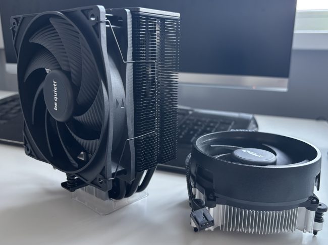 Tai, jog testui pasirinkome „AMD Ryzen 5 7500F“ procesorių, yra pakankamai naudingas scenarijus gamykliniam aušintuvui. Tas pats aušintuvas yra komplektuojamas ir su „Ryzen 5 9600“ serija. Šis procesorius dar labiau būtų pristabdytas silpno aušintuvo, o santykinis kainų skirtumas sumažėtų iki 10%.