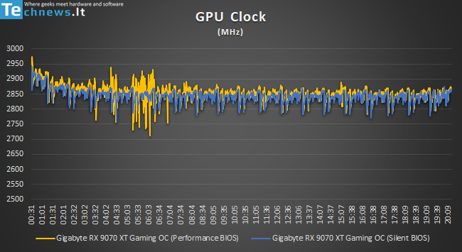 20 minučių trukmės „3DMark Steel Nomad“ strestestas prasideda vaizdo plokštės dažniui siekiant ~2950 MHz, kuris pamažu krinta iki ~2850 MHz. Naudojant Performance BIOS matome šiokį tokį dažnio svyravimą tarp 5 ir 6 testo minutės, nukrentant žemiau 2750 MHz ribos, tačiau skaičiuojant vidutinį dažnį tai nesutrukdo Performance BIOS turėti +10 MHz pranašumą (2854 MHz vs 2844 MHz). Visgi kol kas dar negalime patvirtinti, ar skirtingi BIOS tikrai veikia.