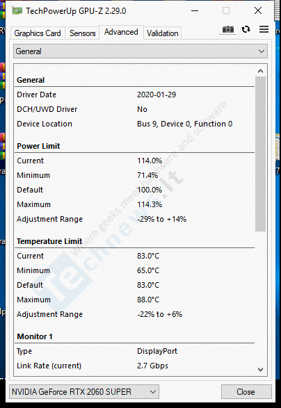Paspartinimas su [1-Click OC] ne tik 25 MHz padidina boost dažnį, bet ir galios limitą. Jis padidinamas 14 %, nuo 175 W iki 200 W, tokiu būdu priartėjant prie 215 W galios limito, kuris taikomas referencinio dizaino „RTX 2070 Super“ vaizdo plokštėms. Perkaitimo taškas lieka nepakitęs (83 °C), kaip ir GDDR6 atminties dažnis (14 000 MHz).