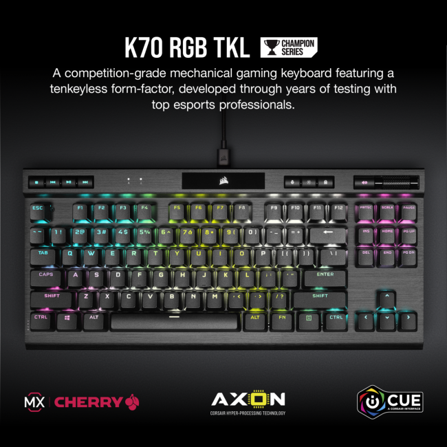 „Corsair K70 RGB TKL“ visiškai išlaiko savo giminaičių dizainą ir atrodo taip pat kaip kitos K70 serijos klaviatūros, tik yra mažesnė, bet tikrai ne prastesnė. Apžvalgai atsiųstas „Corsair K70 RGB TKL“ modelis turi OPX optinius jungiklius, kurie yra ne tik greitesni už mechaninius, bet ir ilgaamžiškesni. Gamintojas deklaruoja, kad šie jungikliai atlaikys net 150 mln. paspaudimų. Klaviatūra taip pat turi 8000 Hz atnaujinimo dažnį, pilną RGB apšvietimą, turnyro jungiklį ir dar daugiau.