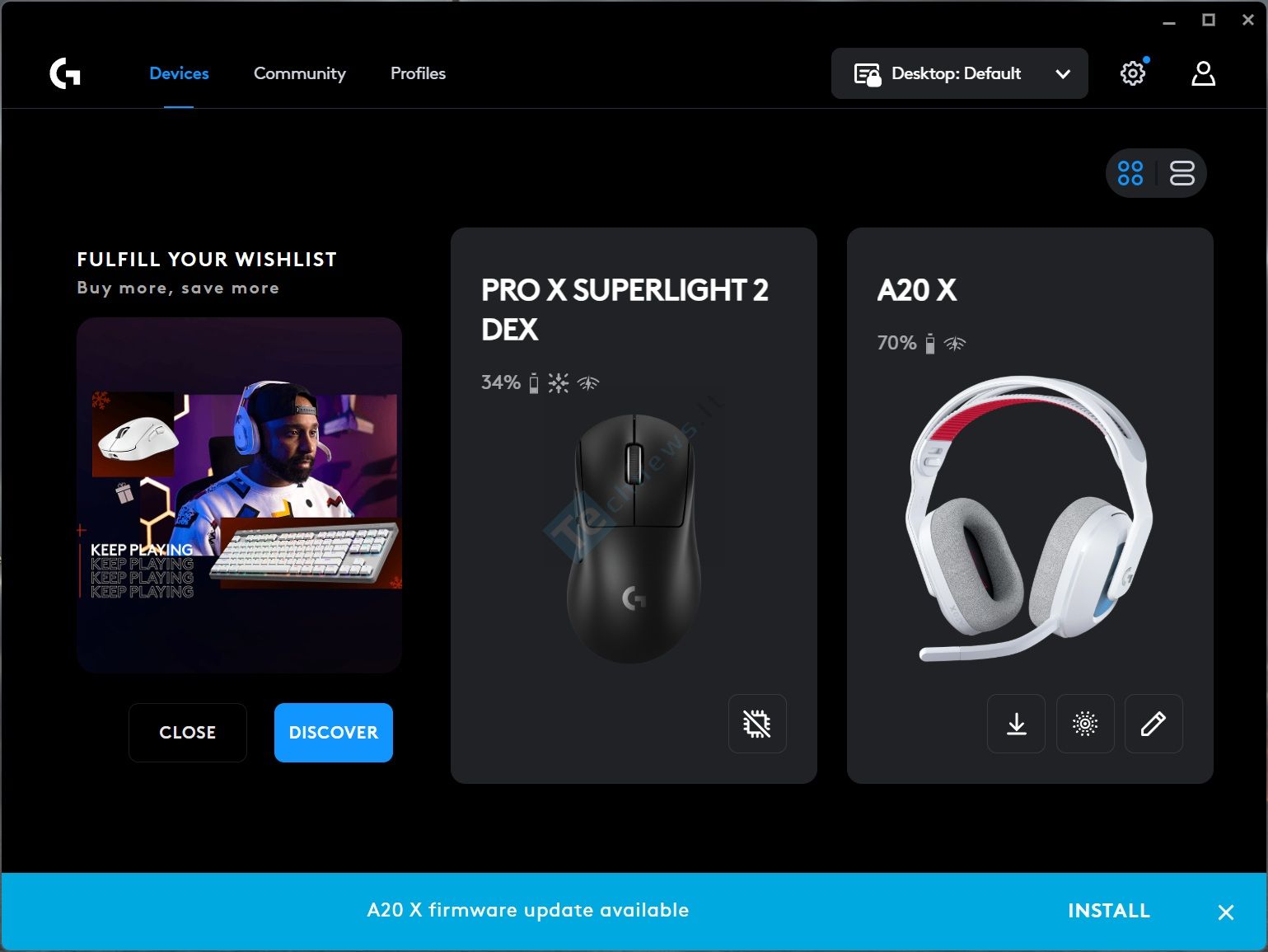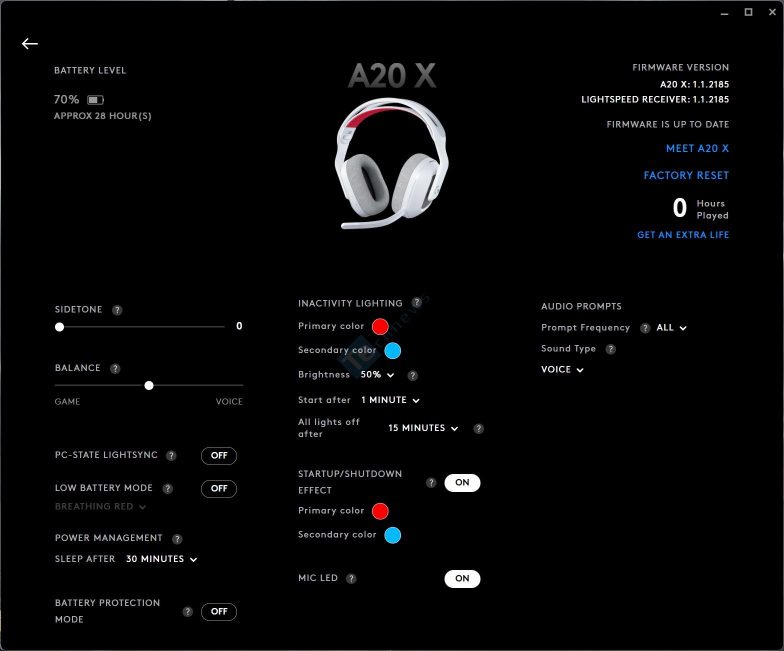 „Logitech Astro A20 X“ palaiko „G Hub“ programinę įrangą, o ten jau galėsime reguliuoti norimus nustatymus. Pirmiausia įjungus programą matome savo įrenginio piktogramą. Paspaudę ant jos, patenkame į tolimesnius nustatymus. Programa tikrina ar yra atnaujinimų įrenginiams ir apie tai praneša.