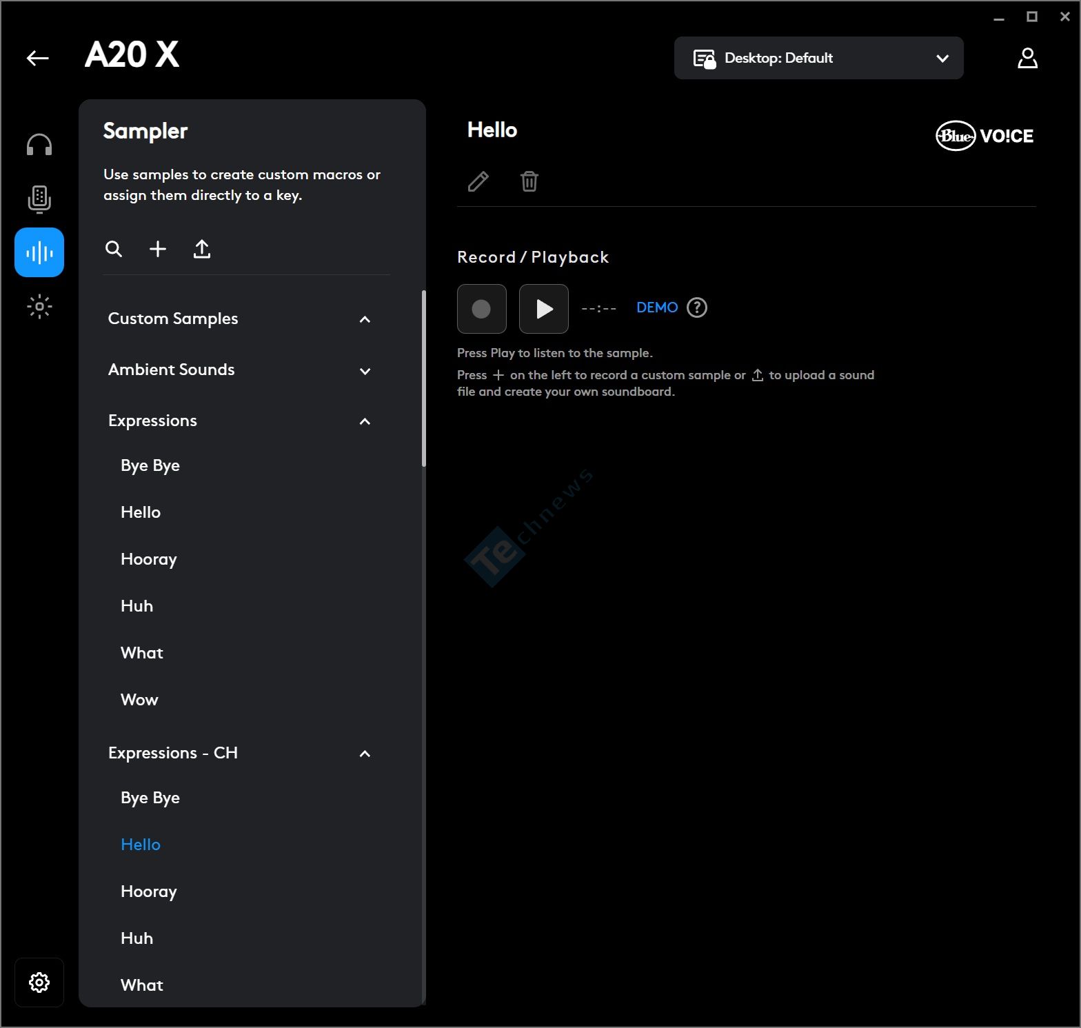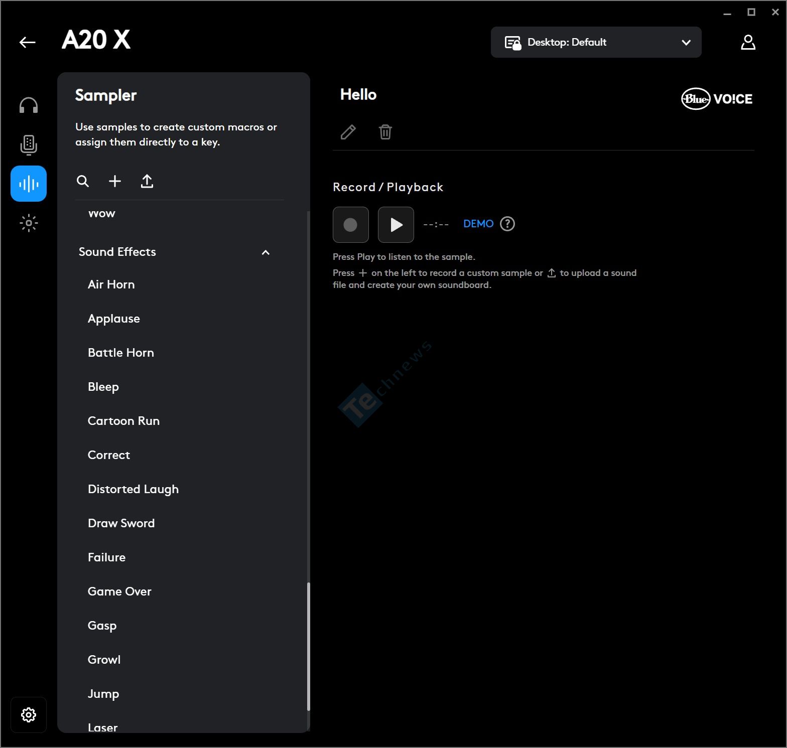 Toliau „Sampler“ skiltis. Čia yra iš anksto įrašyti garso efektai, kuriuos galime panaudoti žaidžiant. Taip pat yra įrašyti pasisveikinimai ir atsisveikinimai ir kiti paprasti žodžiai įvairiomis kalbomis, o juos aktyvuosime per macros.