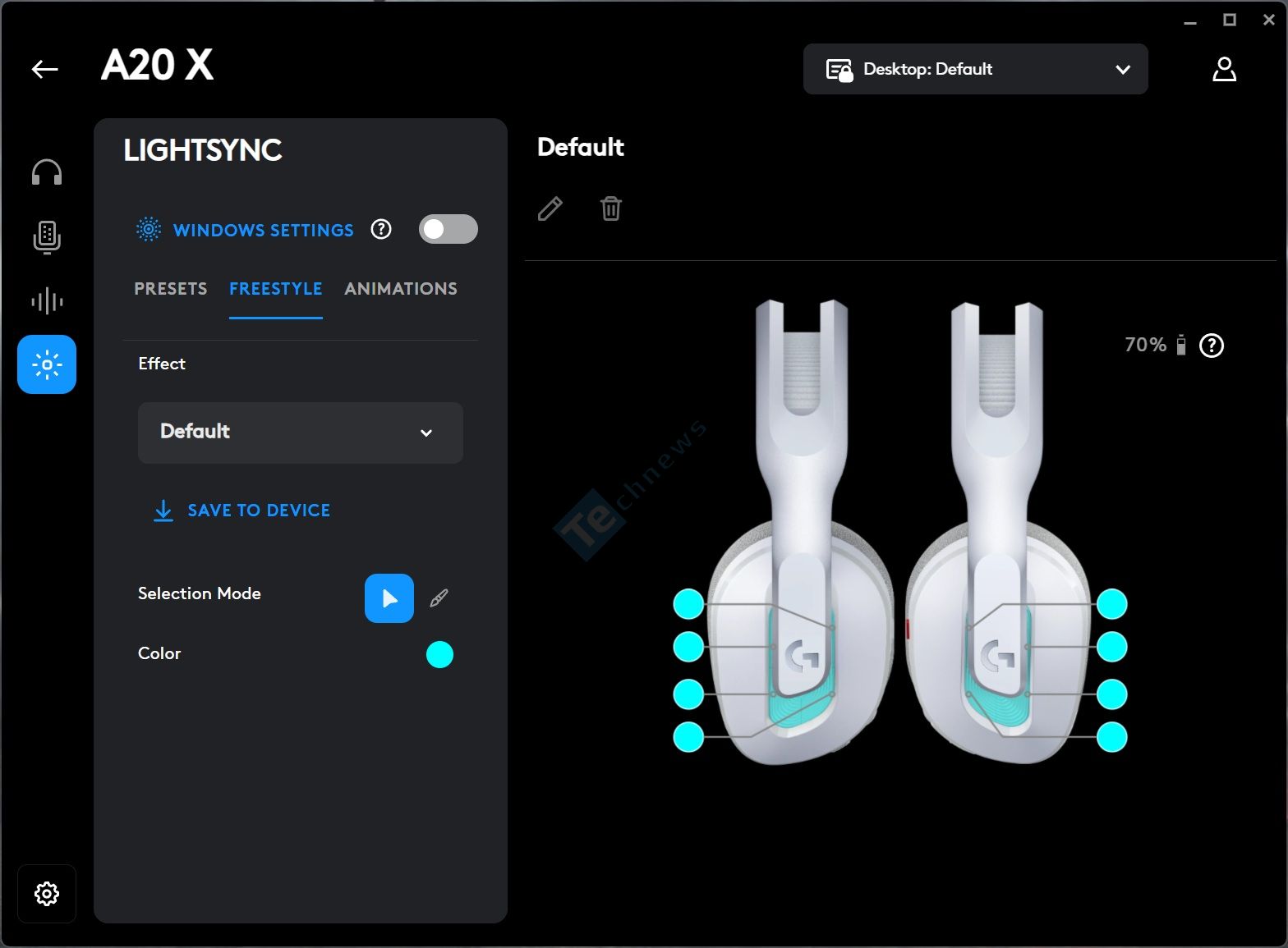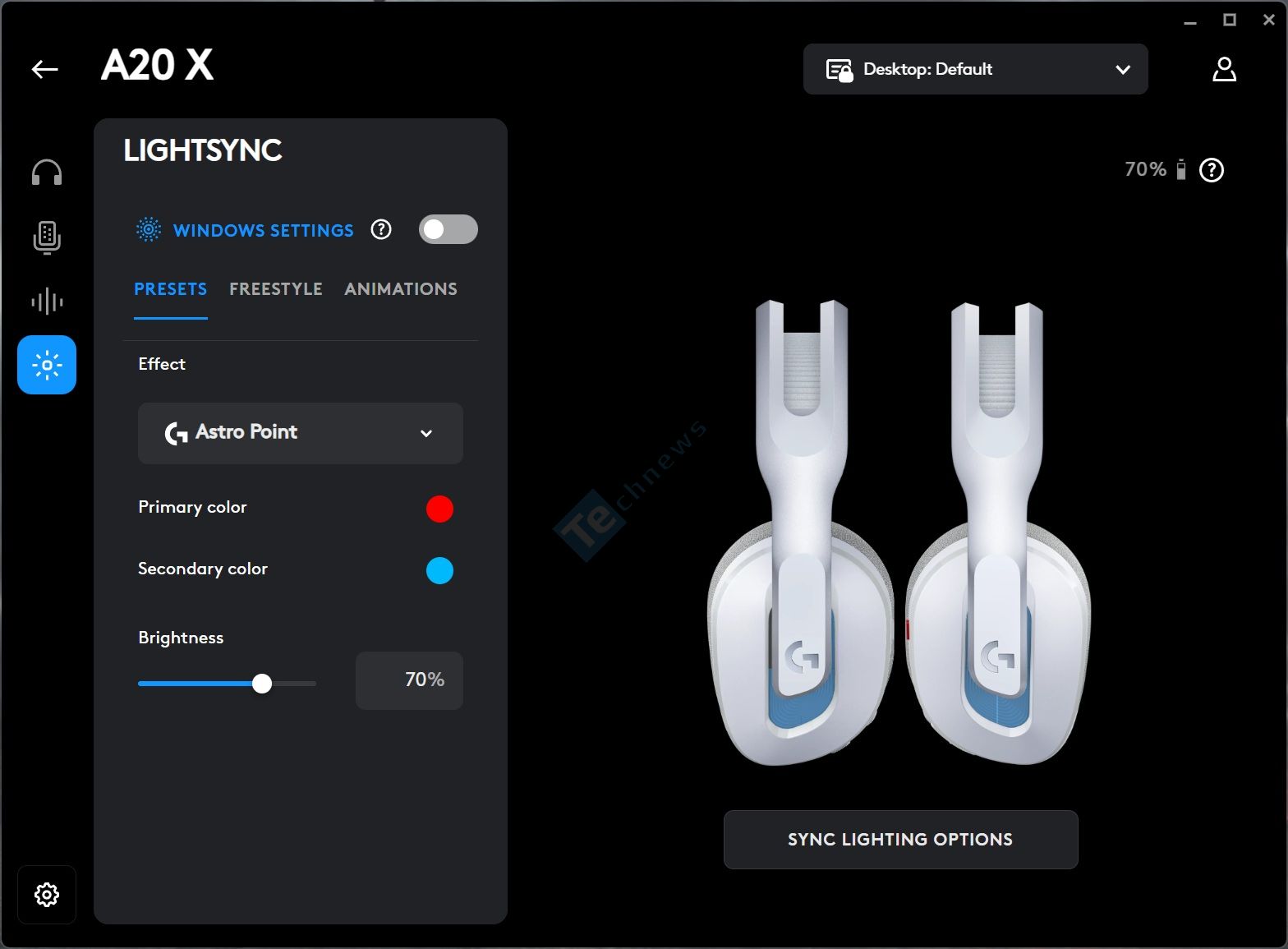 Paskutinė skiltis „LightSync“. Šioje skiltyje galime keisti ausinių apšvietimo nustatymus.
