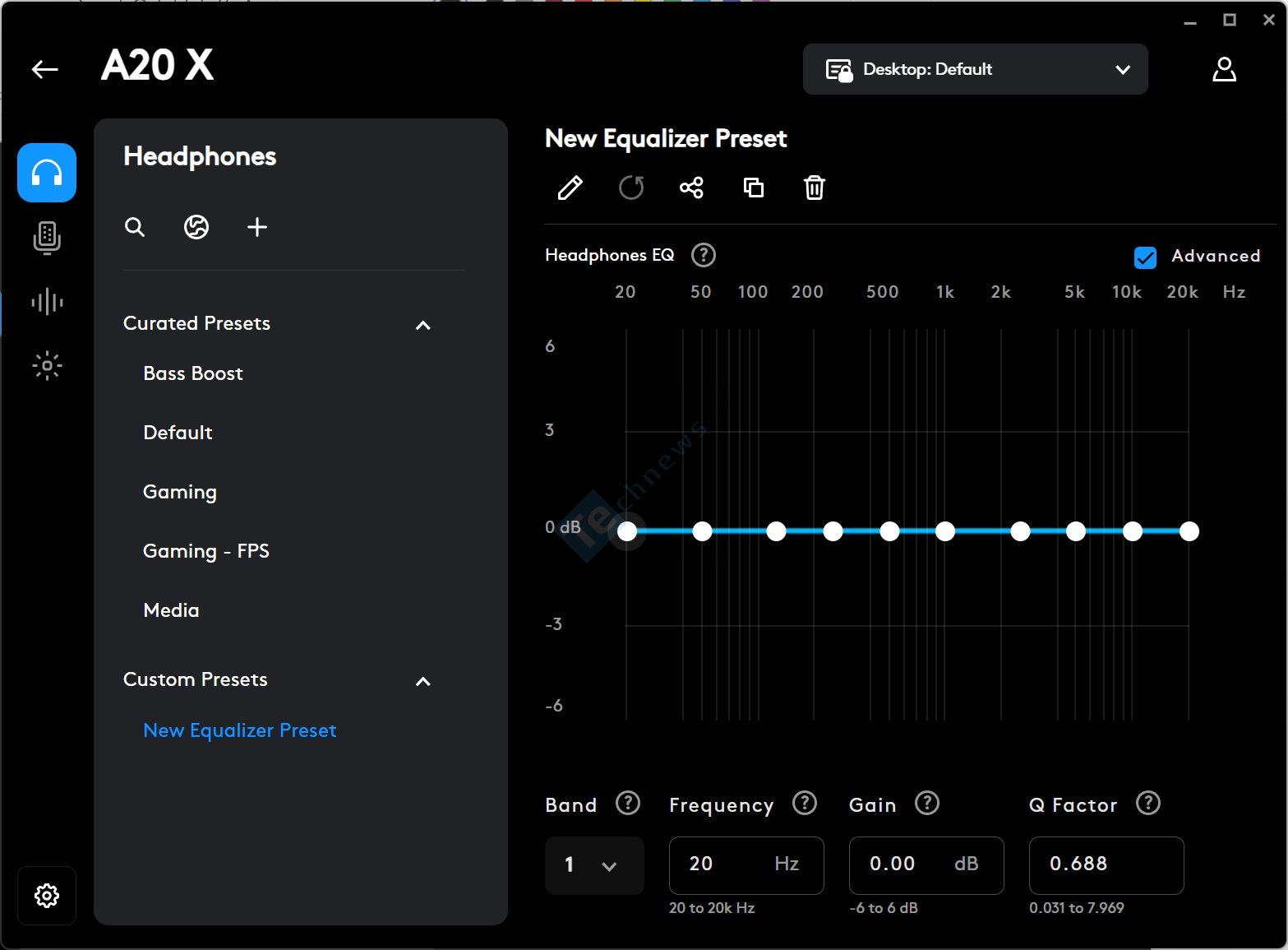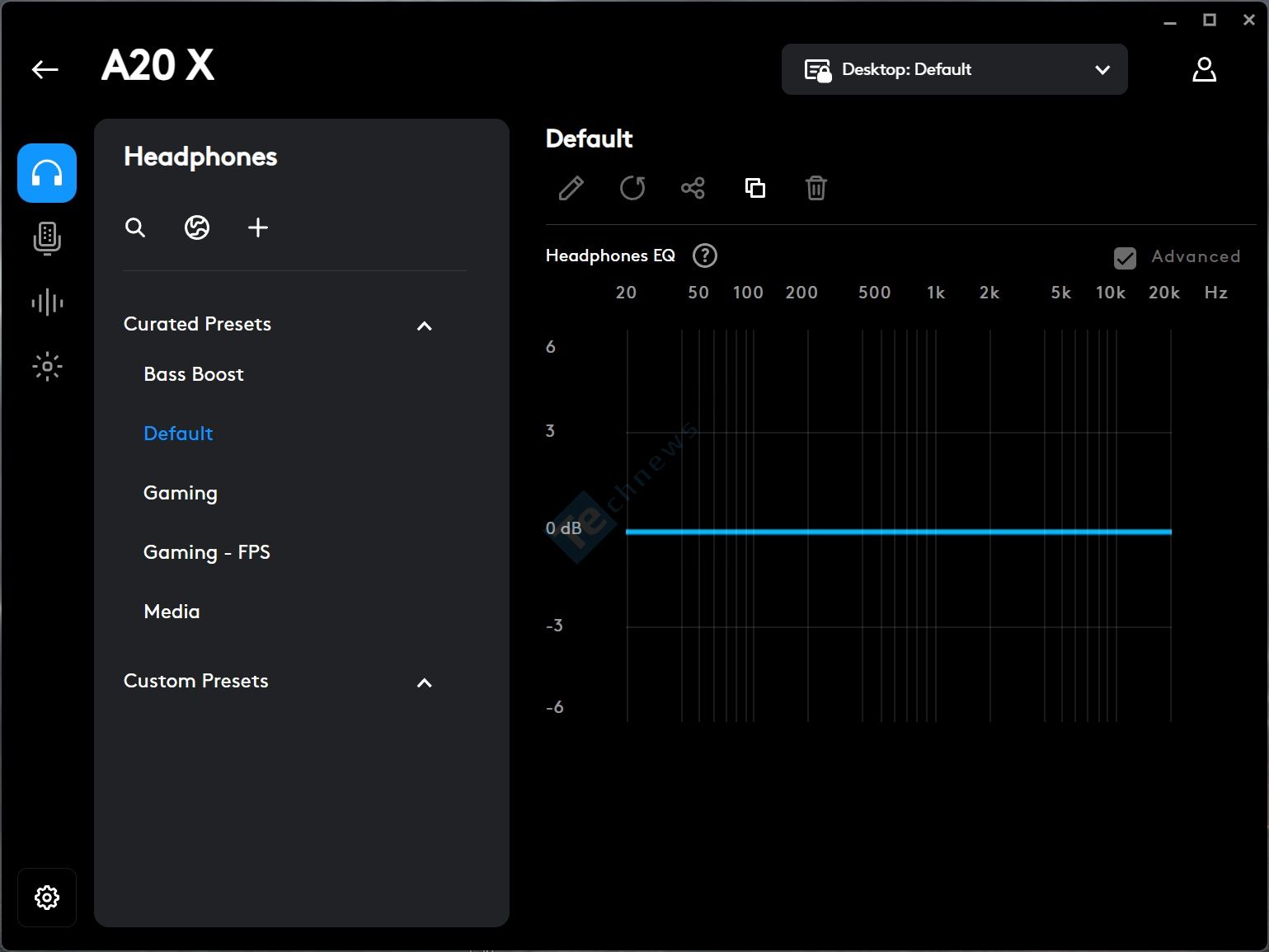 Patekę į nustatymus matome keturias skiltis. Pirmoji iš jų yra „Headphones“. Čia rasime visus garso nustatymus. Galima įsijungti ekvalaizerį ir ten keisti nustatymus pagal savo skonį. „Logitech“ dar siūlo iš anksto sukonfigūruotus garso profilius, jeigu nenorite krapštytis prie nustatymų.