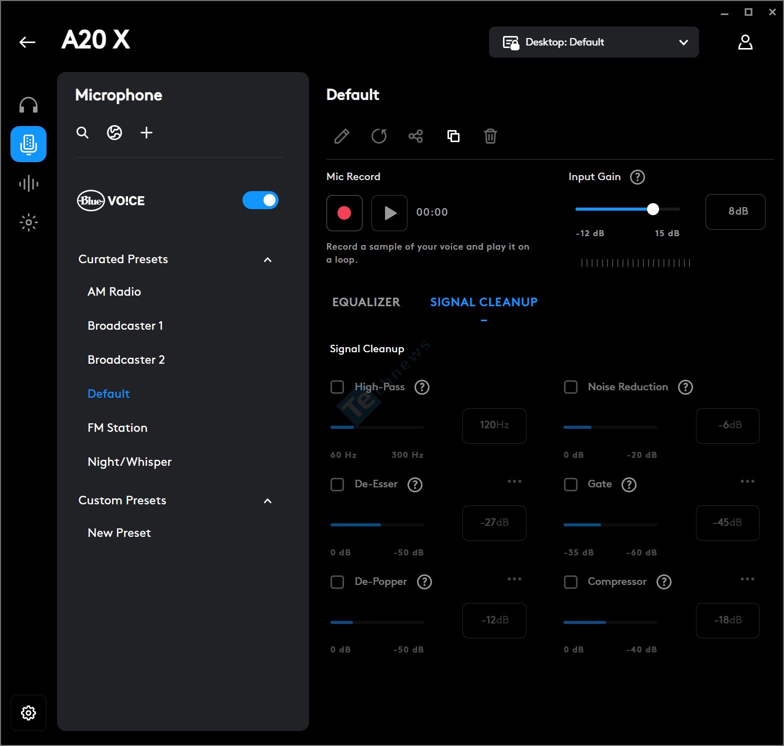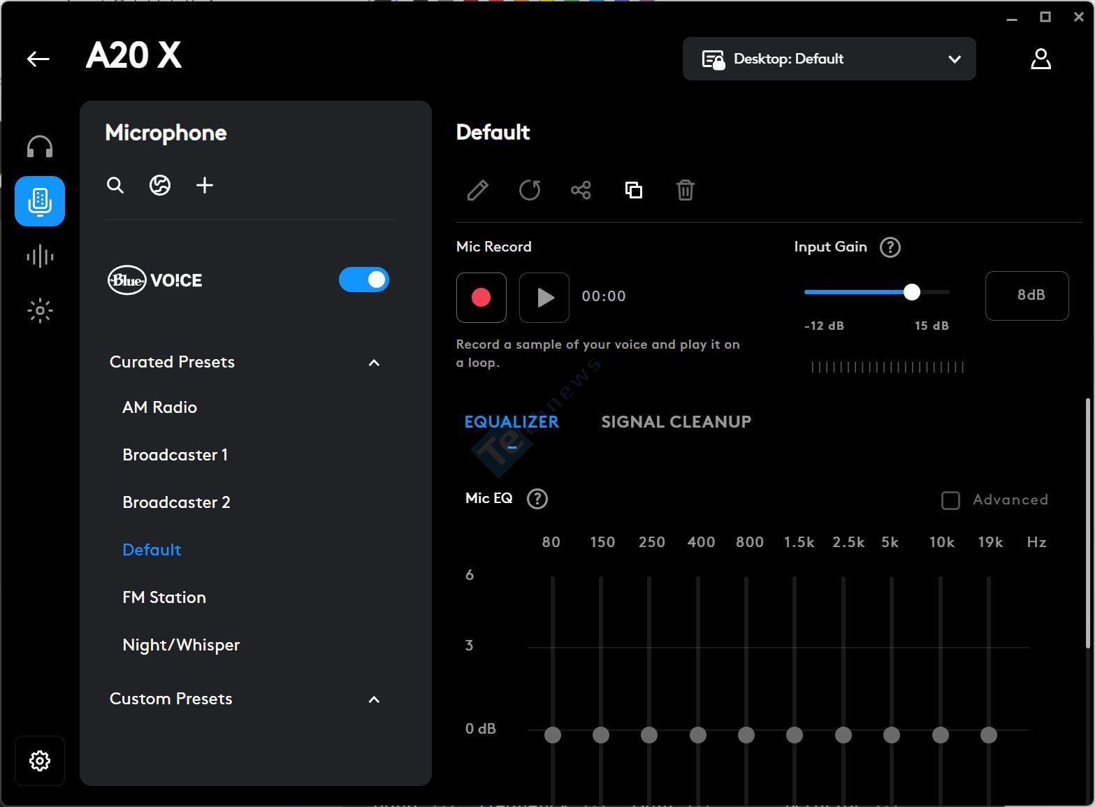 Toliau seka mikrofono skiltis. Kaip suprantate, čia bus pagrindiniai nustatymai mikrofonui. Yra siūlomi iš anksto sukonfigūruoti profiliai, o taip pat galime įvairius nustatymus keisti rankiniu būdu.
