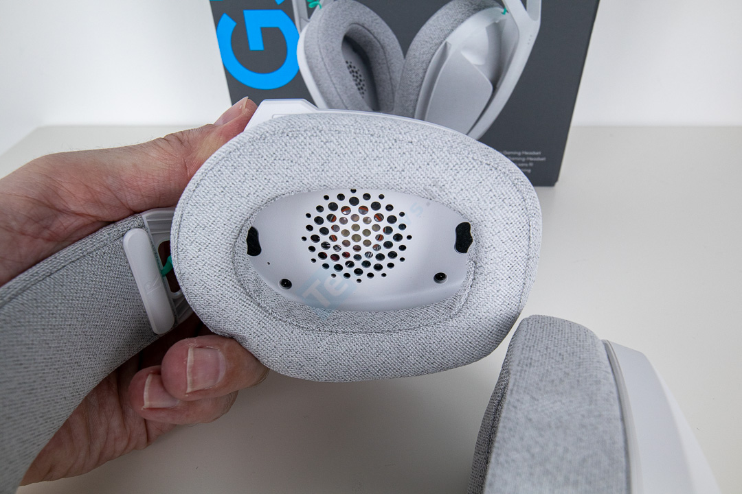 Ausinių kaušeliai yra tikrai dideli, o viduje slepiasi 40 mm membrana. Kadangi ausinės iš pigesnio segmento, tai vidinė kaušelių dalis be medžiagos, matosi plastmasė ir grotelės. Jeigu prie šios plastmasės liesis ausys bus kiek nemalonu, bet čia priklausys nuo ausų formos. To turėtų pavykti išvengti, nes pagalvėlės yra pakankamai gilios, medžiaginės ir minkštos. Kad būtų lengviau orientuotis, virš kaušelio viduje dar yra L ir R raidės, bet man kliuvęs variantas turi sumaišytas šias raides. Net ne iš karto tai pastebėjau, bet tai lengvai galima ištaisyti, nes šios indikacinės plastmasės nusiima.