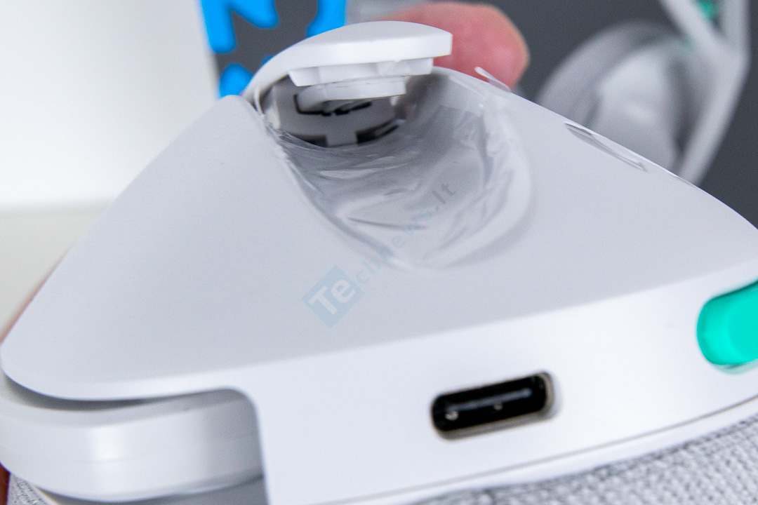 „Logitech G321 Lightspeed“ valdymo mygtukai, tradiciškai, yra ant kairioje kaušelio. Viršuje turime indikacinę lemputę, po to seka stumdomas įjungimo jungiklis, po juo yra Bluetooth mygtukas, o dar žemiau garsinimo ir tylinimo mygtukai. Beje šia garso mygtukai irgi ryškios spalvos.