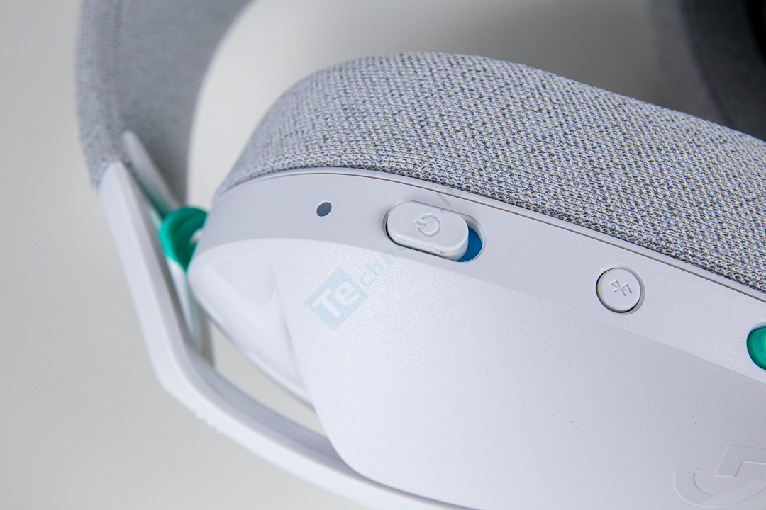 „Logitech G321 Lightspeed“ valdymo mygtukai, tradiciškai, yra ant kairioje kaušelio. Viršuje turime indikacinę lemputę, po to seka stumdomas įjungimo jungiklis, po juo yra Bluetooth mygtukas, o dar žemiau garsinimo ir tylinimo mygtukai. Beje šia garso mygtukai irgi ryškios spalvos.