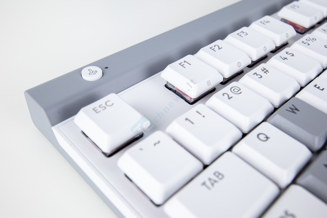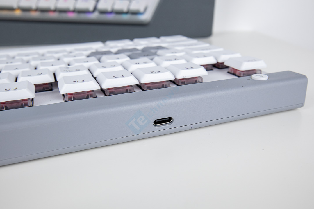 Žiūrint į klaviatūrą iš šonų matome tik aptakų dizainą, viskas paprasta ir gražu. Klaviatūros viršuje yra USB-C jungtis. Čia ir jungsime maitinimo / duomenų kabelį. Gerai yra tai, kad lizdas yra paprastas be papildomų išraitymų ir bus galima naudoti ir savo kabelį.