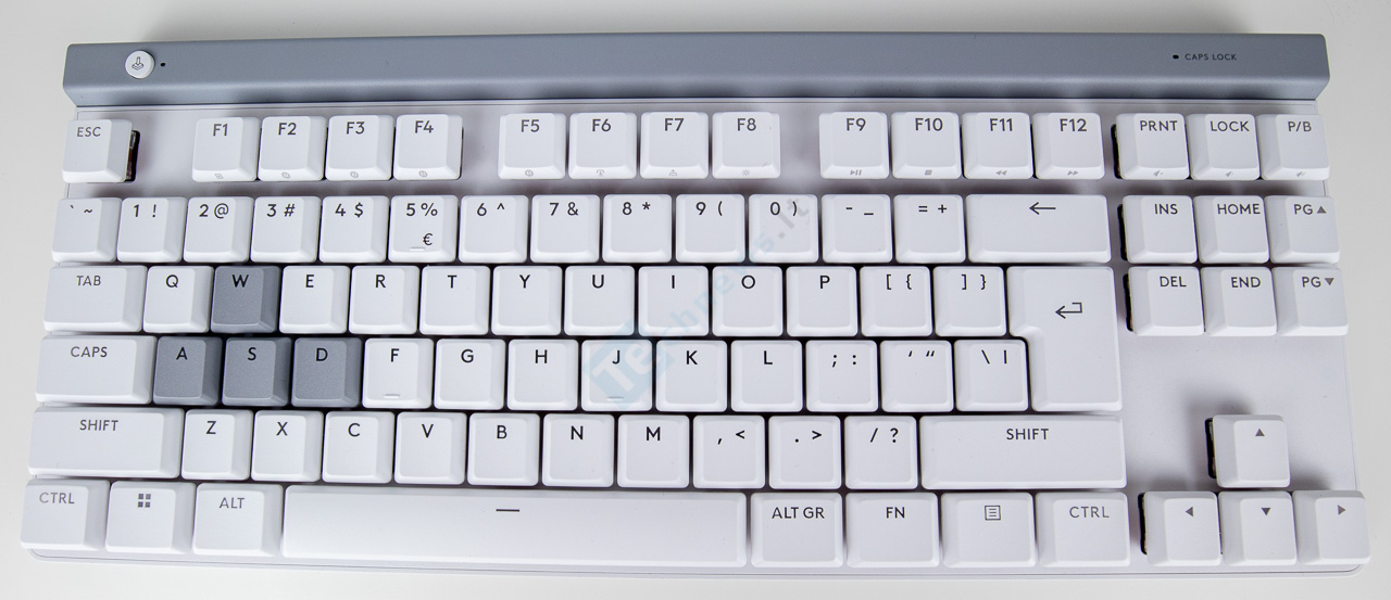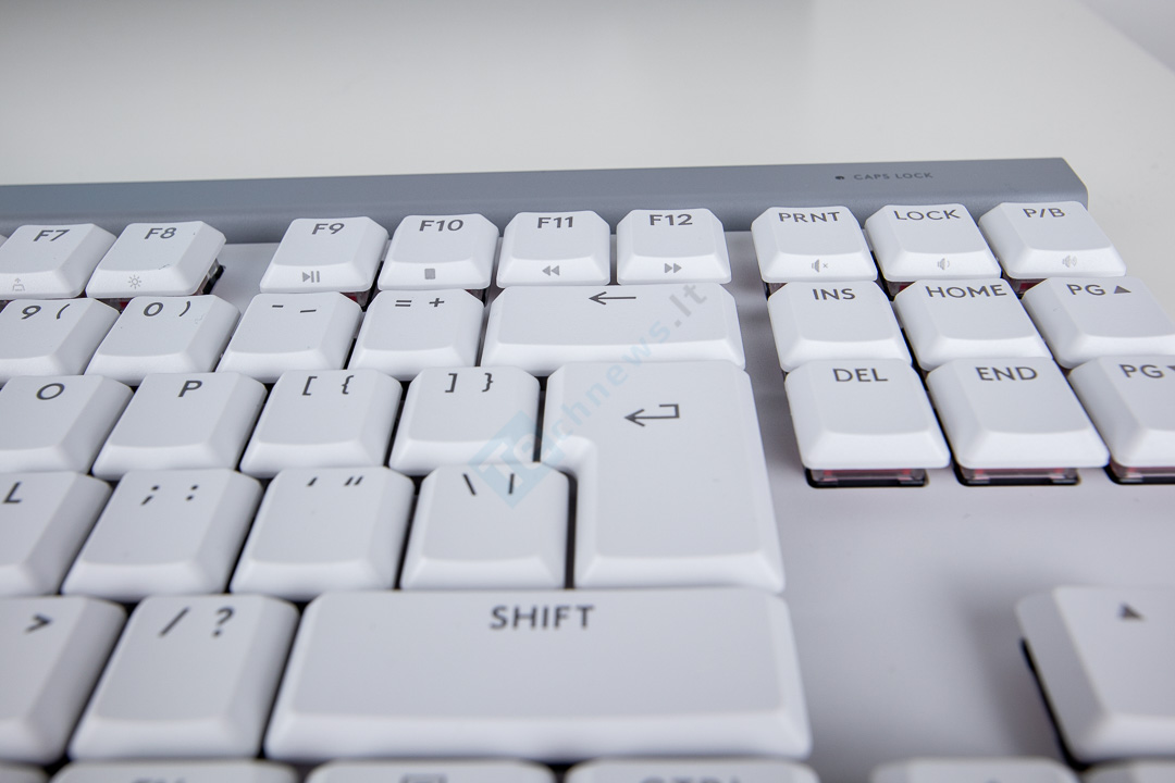 Klaviatūros išdėstymas yra standartinis, bet dėl kompaktiško dydžio viskas yra suspausta. Tarpai tarp mygtukų yra labai maži, bet patys mygtukai yra kiek didesni. Reikės pasibandyti, kaip su tokiu įdėstymų sekasi rašyti. Kadangi klaviatūra pagrinde yra balta, o ant mygtukų esantis šriftas yra juodas, jį lengva įskaityti net be apšvietimo ar prieblandoje. Kadangi klaviatūra labai kompaktiška, dedikuotų mygtukų garsui ar kitoms funkcijoms negauname. Tiesa, su FN ir antrinėmis mygtukų funkcijomis galėsime aktyvuoti nemažai veiksmų.