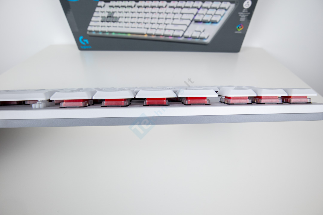 Po mygtukų dangteliais – magnetiniai analoginiai jungikliai. Jų veikimą apibūdinti yra gana sunku. Man jie tuo pat metu primena ir membraninę klaviatūrą ir mechaninę. Jungiklių eiga atrodo stabili ir užtikrinta ir juos labai malonu spausti. Pasak „Logitech“, jungiklių nuspaudimui reikalinga 35 g galia. Šių analoginių jungiklių eiga yra tik 2,5 mm, o kas įdomiausia, kad aktyvacijos vietą galime nusistatyti patys su programine įranga nuo 0,1 mm iki 2,5 mm. Nežinia kodėl, bet „Logitech“ savo klaviatūroms ištvermės reitingo nepateikia.