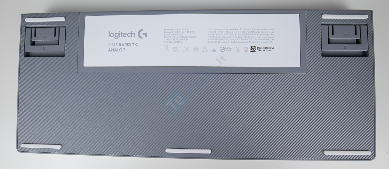 Klaviatūros dugne yra penki pailgi balti padukai. Jie iš kokybiškos gumos ir klaviatūrą ant paviršiaus laiko labai gerai. Aukščiui reguliuoti skirtos dviejų pakopų kojelės. Jos irgi su guminiais padukais.