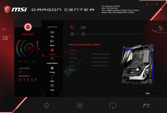 Svariausias „MPG Z390 Gaming Pro Carbon“ pranašumas prieš „Aorus“ – gebėjimas dirbti su 4000+ MHz DDR4 operatyviąja atmintimi. MSI pagrindinė plokštė garantavo stabilumą tiek su „Corsair Vengeance RGB PRO“, tiek su „Patriot Viper RGB“ moduliais aktyvavus jų XMP 2.0 profilius, kuomet su „Aorus“ praradome, atitinkamai, 400 MHz ir 633 MHz. Be to, pastebėjome, kad MSI atmintį treniravo kosminiais greičiais palyginus su „Aorus“ vėžlio tempais. MSI produktą taip pat galėtų svarstyti dvi vartotojų grupės. Pirma, labiau prijaučiantys muzikai, kadangi joje integruotas papildomas operacinis stiprintuvas ausinėms, o kartu geresni ir garso posistemės rezultatai RMAA teste. Antrąja grupe tampa prijaučiantys RGB pašvietimui. „MPG Z390 Gaming Pro Carbon“ šiuo aspektu yra visa koja prieky „Aorus“, kadangi siūlo gerokai turtingesnius RGB efektų profilius, o atskiros zonos gali būti sukonfigūruotos nepriklausomai viena nuo kitos. Be to, yra integruotas specialus 3-pin lizdas RGB palaikančioms „Corsair“ juostelėms ar ventiliatoriams, o jų produkcija tikrai populiari. MSI motininė plokštė turėjo problemų išlaikant sinchronizaciją tarp jos ir „Corsair Vengeance RGB PRO“ modulių, tačiau iki šiol dar nesusidūrėme su pagrindine plokšte, kuri tai atliktų idealiai.