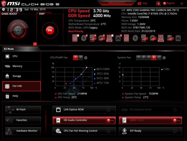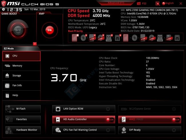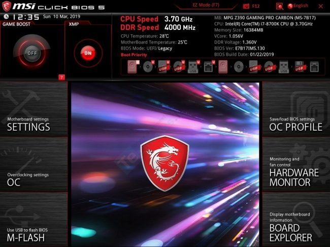 EZ Mode pasitinka su pradinio lygio informacija ir nustatymų keitimu. Vartotojas gali greitai įjungti XMP profilį, Game Boost (padidina CPU dažnį), pasiekti dažniausiai naudojamų nustatymų aplanką, po papildomo perkrovimo inicijuoti UEFI BIOS atnaujinimą su M-Flash įrankiu, taip pat vienu paspaudimu patekti į Hardware Monitor įrankį. Tą patį galima padaryti iš Fan Info sekcijos, kurioje galima sekti prie kiekvieno kanalo prijungto ventiliatoriaus sūkius, sūkių kreivę arba DC įtampą, jeigu prijungtas 3-pin ventiliatorius. Džiugu matyti, kad MSI nepamiršo integruoti nustatymų paieškos (angl. search) variklį.