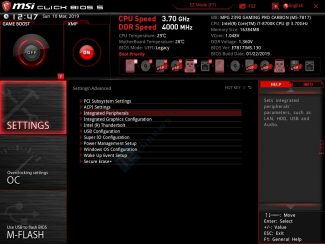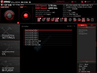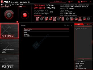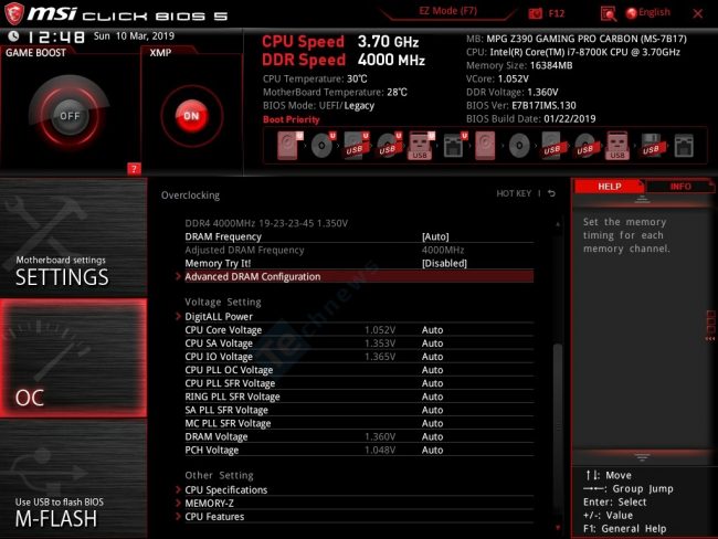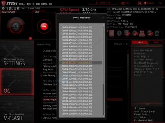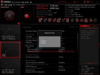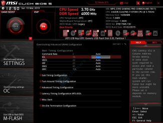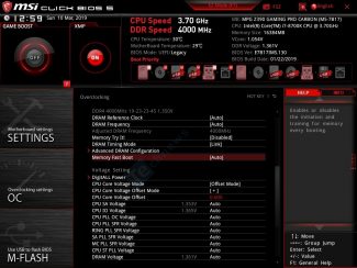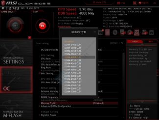 Visus pagrindinius nustatymus MSI laiko OC sekcijoje. Išskleidus Misc Setting skiltį randame Enhanced Turbo nustatymą, kuriam priklauso trys (auto, enabled, disabled) parinktys. Maksimalus DRAM dažnis kyla iki 6000 MHz. Tai yra gerokai mažiau už tai, ką matėme kitų gamintojų Z390 pagrindinių plokščių UEFI BIOS, tačiau 6000 MHz ir taip yra per daug. Memory Try it! skiltyje randame keletą paruoštų dažnio ir atsako laikų kombinacijų operatyviajai atminčiai. Advanced DRAM Configuration skiltyje vartotojas gauna galimybę atsako laikus koreguoti rankiniu būdu.