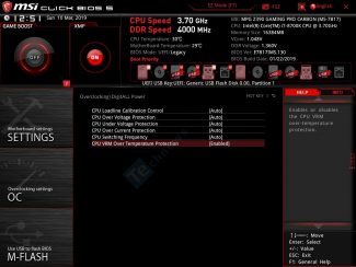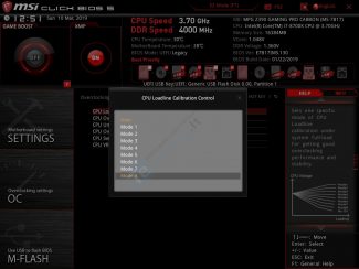 DigiALL Power skiltyje randame aštuonių lygių LLC (Load Line Callibration) nustatymą. Pagal MSI politiką, artimensnę įtampą nustatytai UEFI BIOS duos žemesnio lygio režimas, pavyzdžiui, Mode 2. Čia pat turime galimybę išjungti apsaugą perkaitus VRM grandinei, tačiau to daryti nerekomenduojame, ypač pasiruošusiems spartinti 6 ar 8 branduolius turinčius „Coffee Lake“ procesorius.