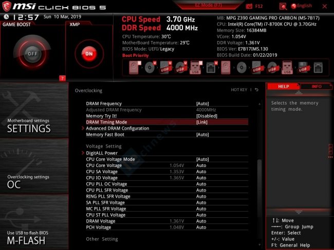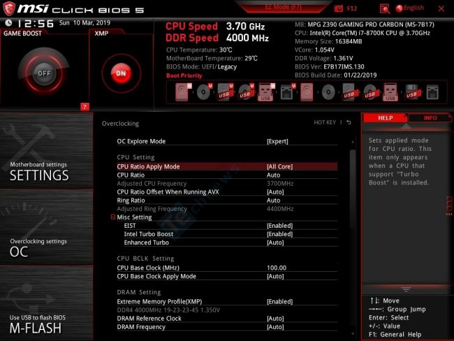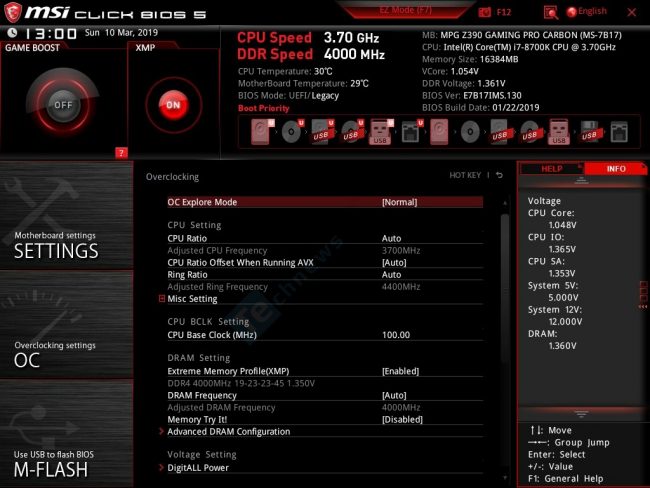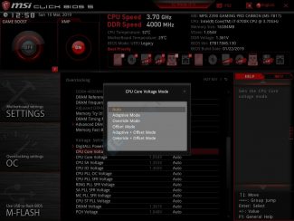 Labiau patyrę vartotojai iškart gali perjungti navigacinį OC Explore Mode režimą iš Normal į Expert. Tai prideda daugiau funkcionalumo. Pavyzdžiui, atsiranda galimybė taikyti skirtingus gaišties laikus atminties kanalams (DRAM Timing Mode nustatymas), taip pat atsiranda galimybė pakeisti CPU įtampos režimą iš automatinio į adaptyvų, nekintantį ar jų kombinaciją su offset reikšme. „MPG Z390 Gaming Pro Carbon“ geba keisti CPU įtampą 0,005 V žingsneliais, o ribinės offset reikšmės yra plačios ir siekia +/- 600 mV.