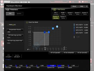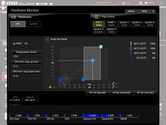 Visgi vartai į ventiliatorių valdymą nėra Fan Info, o Hardware Monitor įrankis. Sūkių kreivės „gamybai“ rankiniu būdu duoti keturi temperatūriniai taškai. Reguliuojama 1 °C/ 1 % tikslumu su galimybe nusistatyti zoną, kurioje ventiliatoriai nesisuks. Į atliekamas korekcijas ventiliatoriai reaguoja on the fly režimu, nereikalingi jokie papildomi veiksmai, tačiau MSI neduoda jau sukonfigūruotų profilių, be to, šaltinių skaičius, pagal kuriuos kinta sūkiai, apriboti iki CPU ir sistemos temperatūrų. Apačioje esančioje juostoje išdėstytos pagrindinių mazgų įtampos bei temperatūros. VRM grandinės temperatūros nematome.