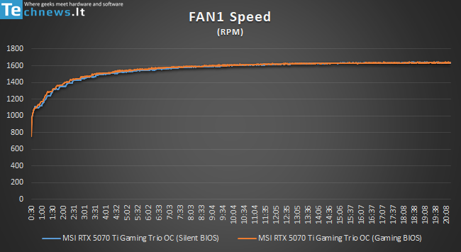 Kadangi abi Gigos plokštės turi tą pačią aušinimo sistemą, 5070 Ti Gaming OC prie 1600 RPM būtų irgi garsesnė. Bet kas ten žino, gal Gaming OC fanai įsisuktų tik iki 1200 RPM…